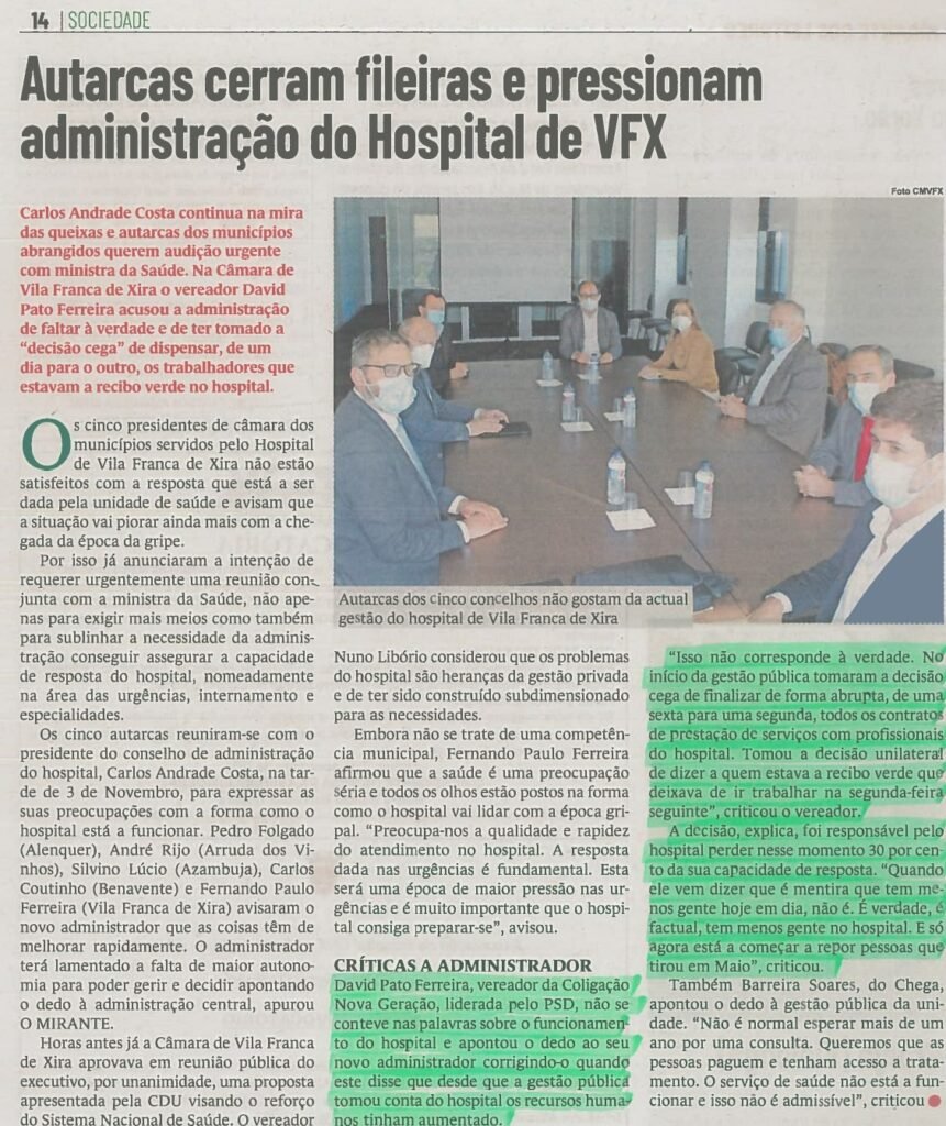 Na reunião de Câmara de dia 17 de Novembro a Coligação Nova Geração apresentou a proposta “Comissão Municipal de Acompanhamento dos Cuidados de Saúde de Vila Franca de Xira”. A proposta foi aprovada por unanimidade.